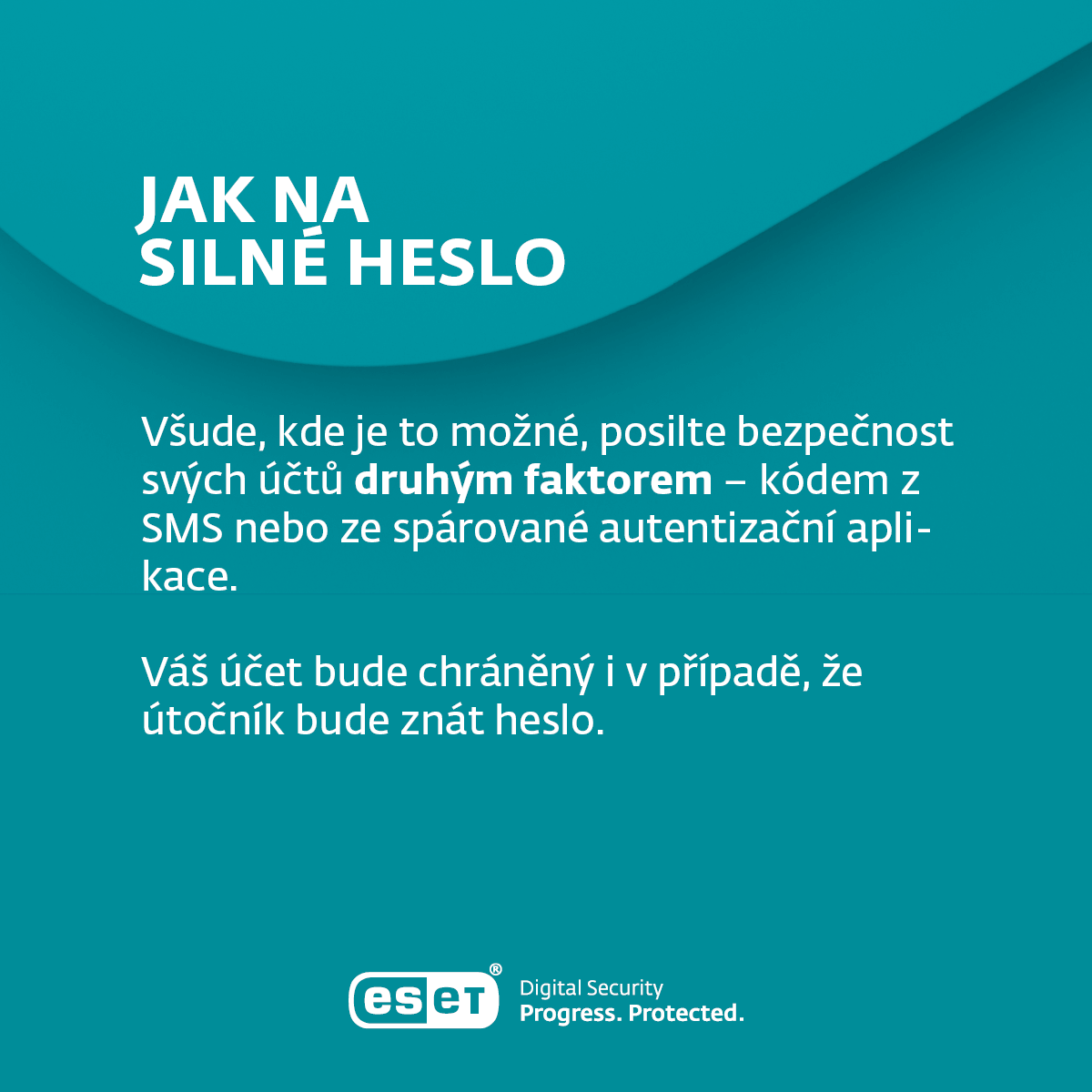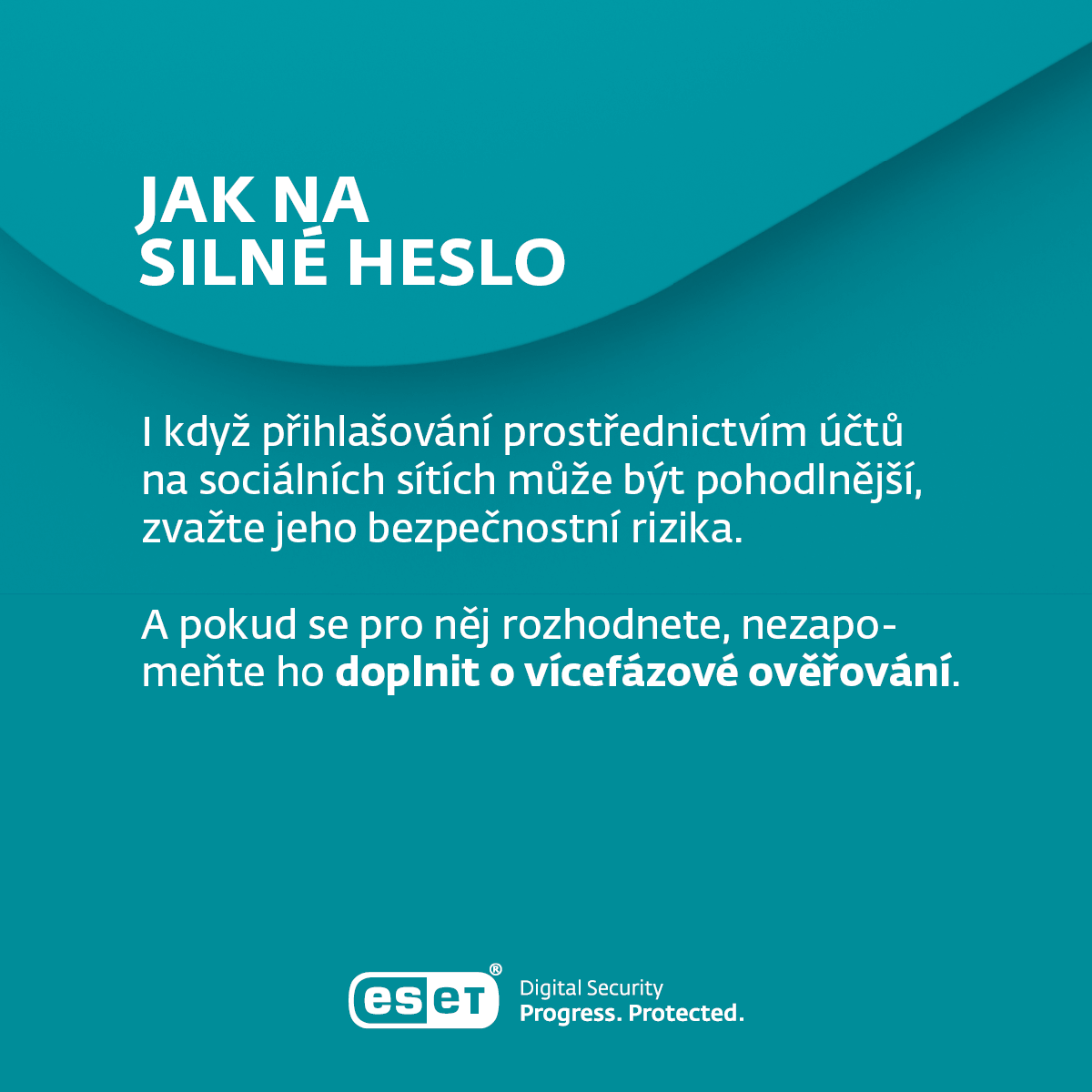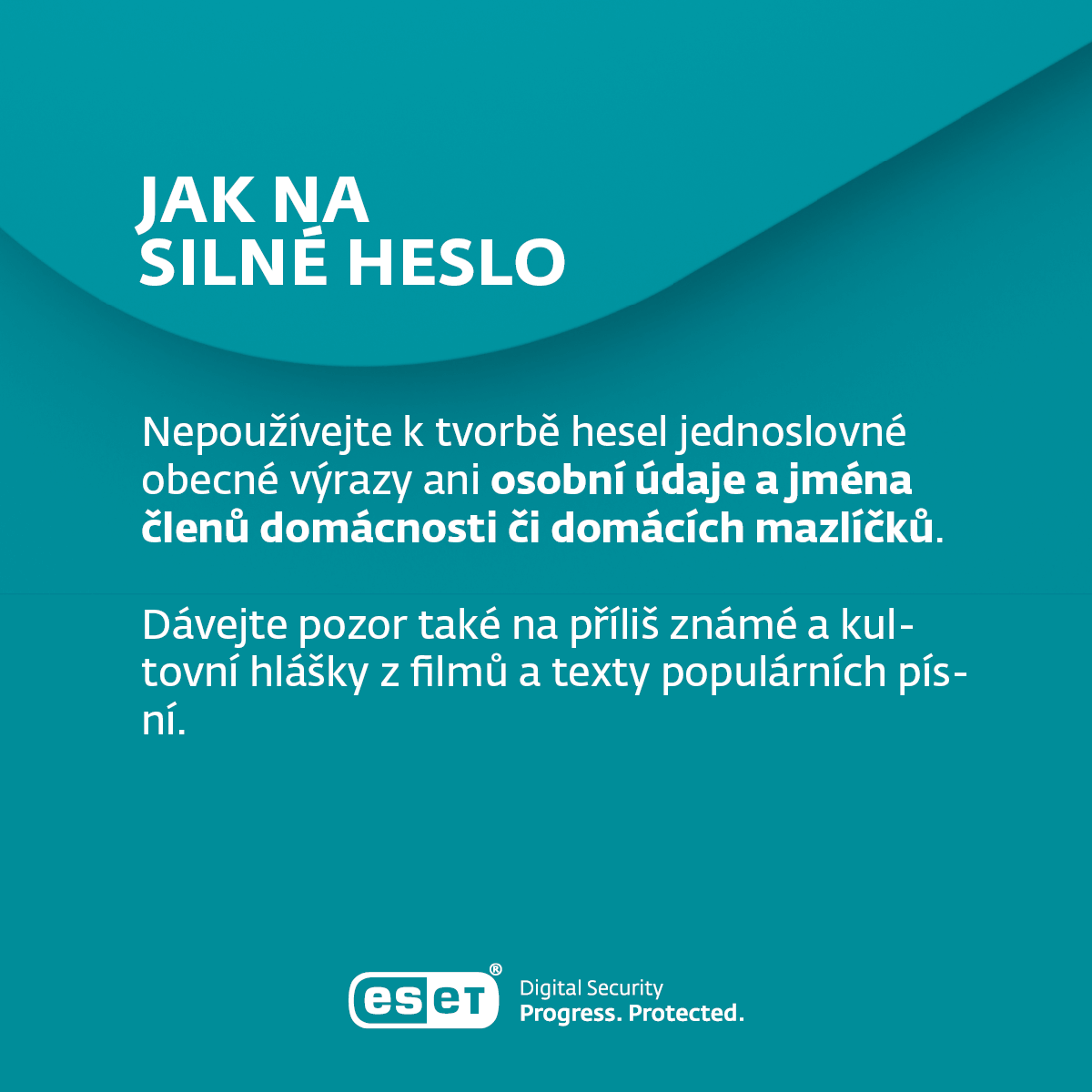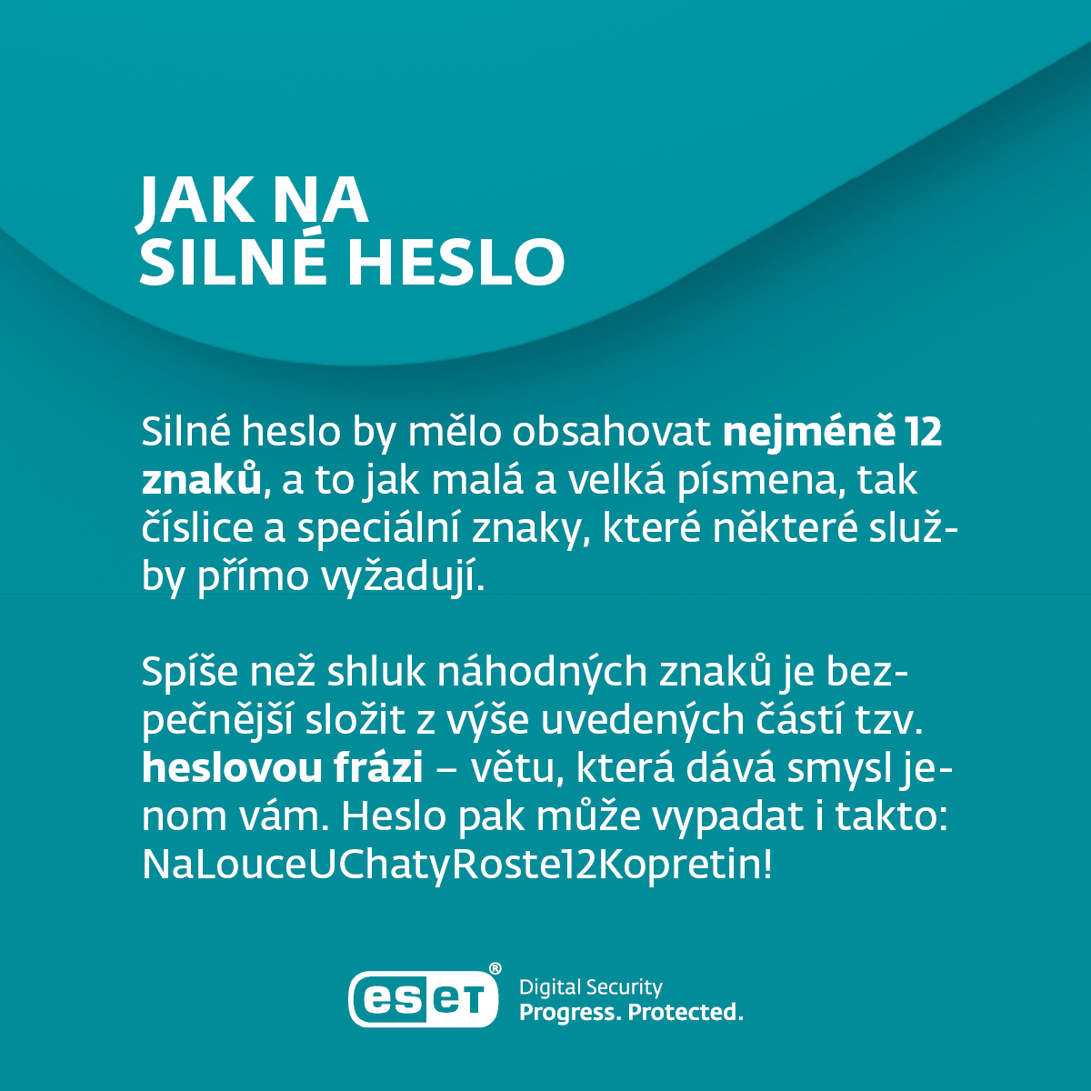 Lepší je tak zvolit např. heslovou frázi – větu nebo spojení slov, které dává smysl jen nám. Ani ta by ale neměla přímo souviset s našimi osobními údaji nebo informacemi o naší rodině a koníčcích – útočníci si je totiž mohou snadno zjistit například z veřejných informací na sociálních sítích.