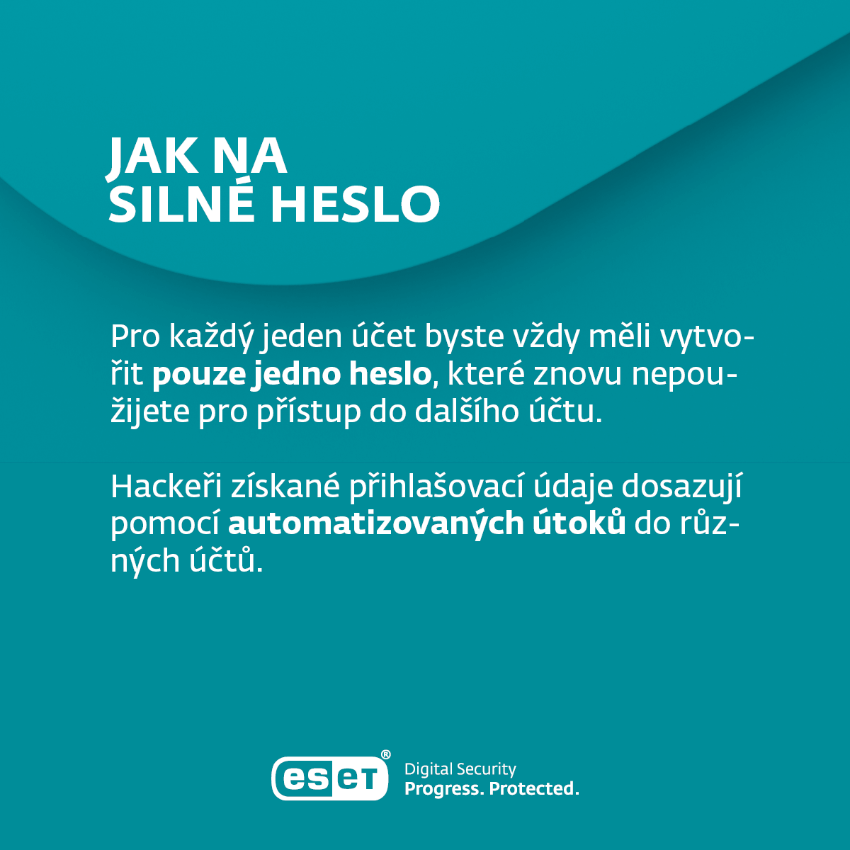 Jen jedno heslo do všech účtů využívá 7 % dotázaných, to je ovšem podle bezpečnostních expertů velice riskantní. Používání unikátního hesla pro každou službu je dle nich jednou z nejdůležitějších zásad pro bezpečnost našich online účtů. Nezbytné je také využívání vícefázového ověřování, kdy je při přihlášení kromě hesla vyžadováno ještě dodatečné ověření např. kódem zaslaným v SMS či e-mailu nebo potvrzením v ověřovací aplikaci.
