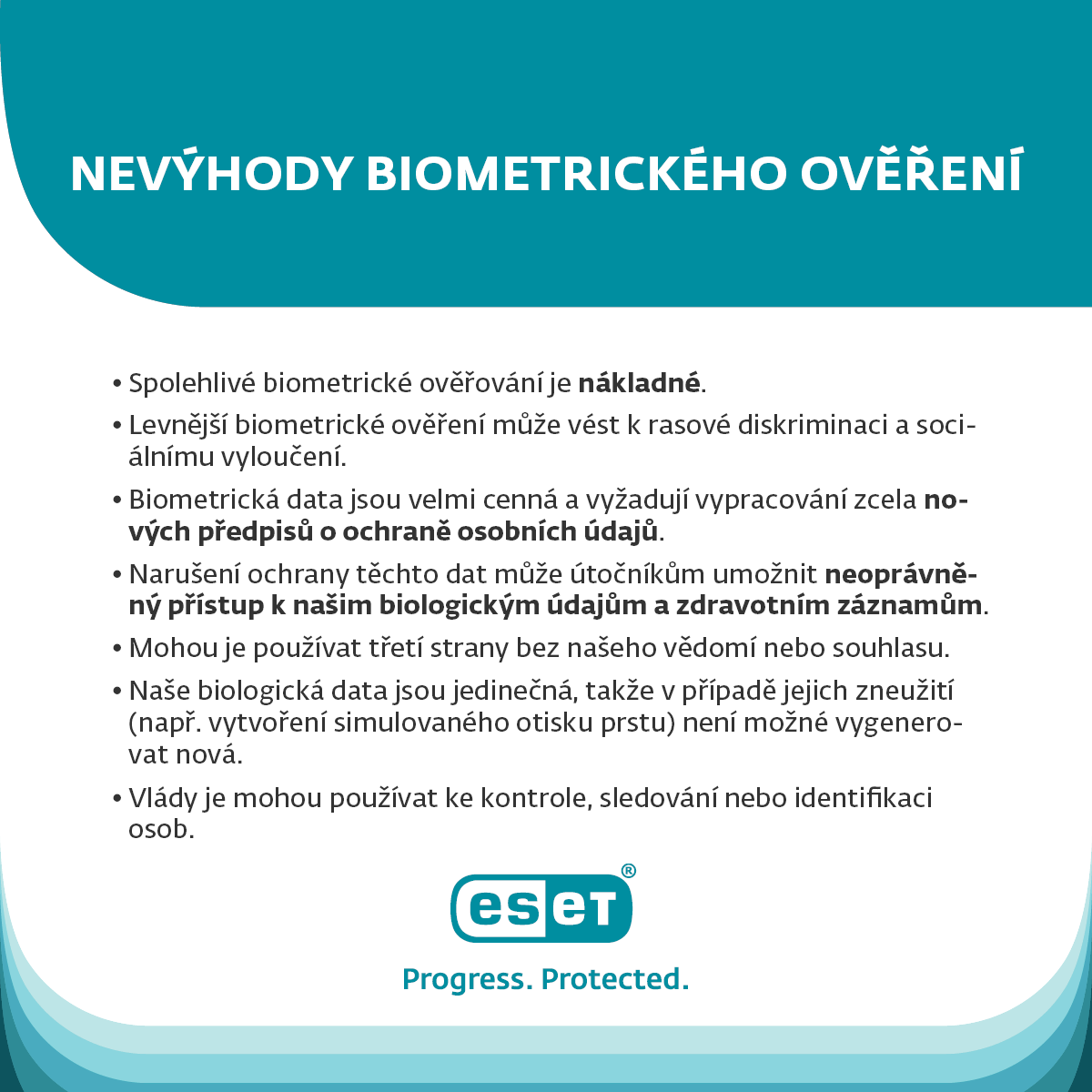 Všechny zmíněné technologie sice mohou nahradit dlouhá a těžko zapamatovatelná hesla, ale jejich používání také může zpřístupnit naše osobní údaje, aniž bychom vždy věděli, jak budou použity.