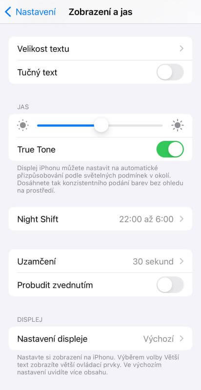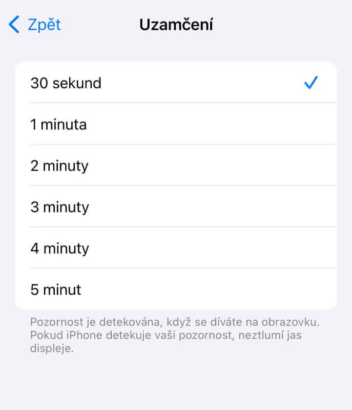 Nastavení zámku obrazovky je vhodné doplnit o aktivování dalších bezpečnostních funkcí. Jednou z nich je nastavení doby, po jejímž uplynutí se iPhone automaticky zamkne. Najdete jí v Nastavení → Zobrazení a jas → Uzamčení a nastavte časový interval. Poté nastavte akce, které můžete provádět na zamčené obrazovce.